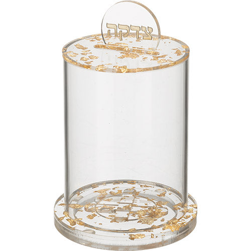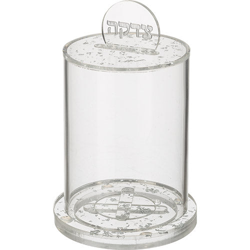 Expertly crafted from high-quality acrylic material, our Tzedakah box features a stylish round design and subtle glitter embellishment. This sleek and durable box combines practical functionality with elegant aesthetics, making it the perfect solution for collecting and giving charity in a modern and sophisticated way.