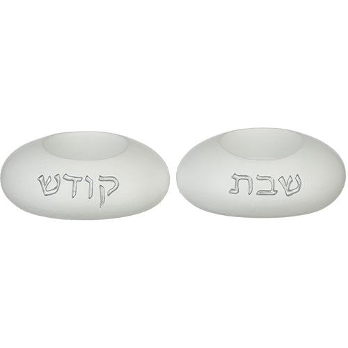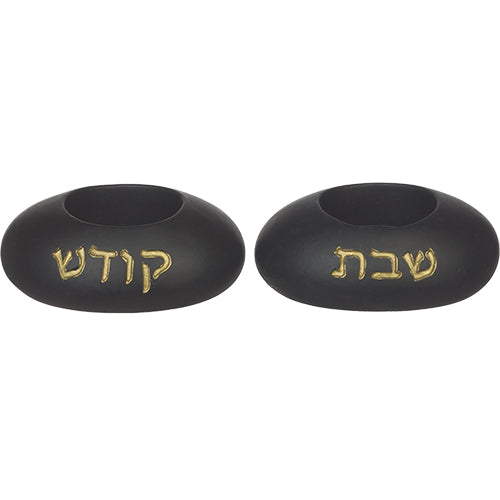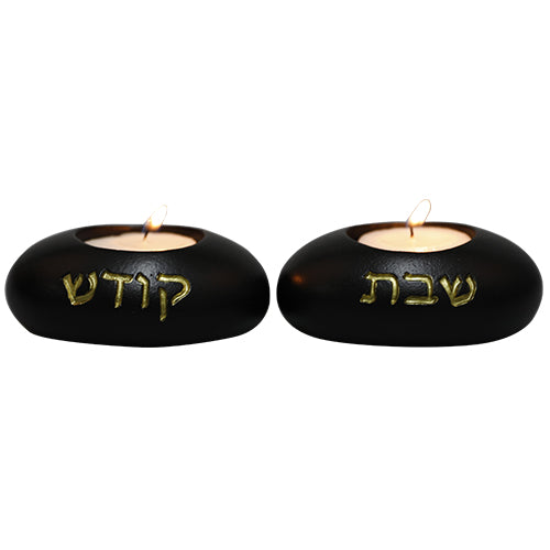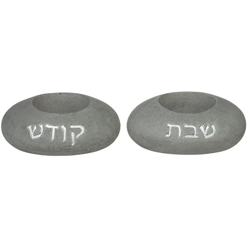 Modern polyresin candle holders engraved with "Shabbat" and "Kodesh" in Hebrew lettering. These elegant 9cm (3.5") diameter holders are designed for standard tea lights, bringing both style and tradition to your Shabbat table.
