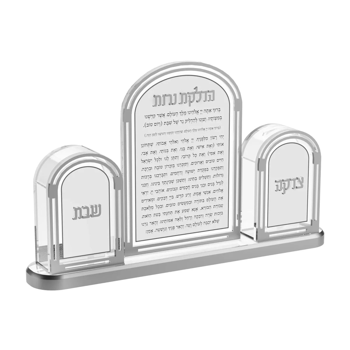 Elevate your Shabbos experience with the Classic Hadlakos Neiros Set.. A one-of-a-kind addition to your home, this set includes Hadlakos Neiros Brochos, Tzedakah Box, and Match Holder, all with raised 3D titles and borders. With its elegant gold or silver finish and easy-to-read text on a white background, it's both beautiful and functional. The perfect gift for yourself or a loved one.