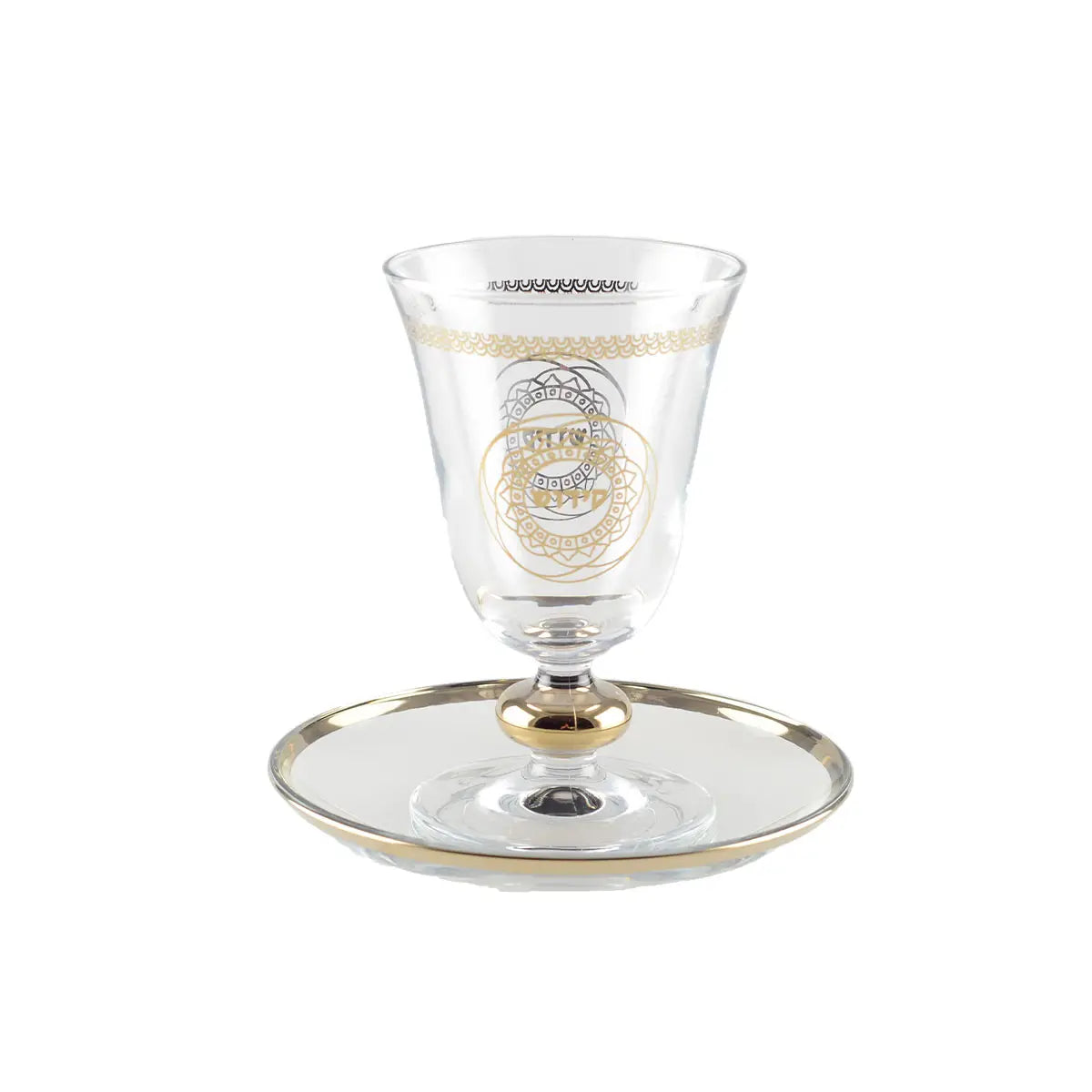 Elegant glass kiddush set featuring delicate gold and silver mandala patterns. This traditional wine cup comes with a matching saucer, both adorned with graceful geometric designs and metallic trim.