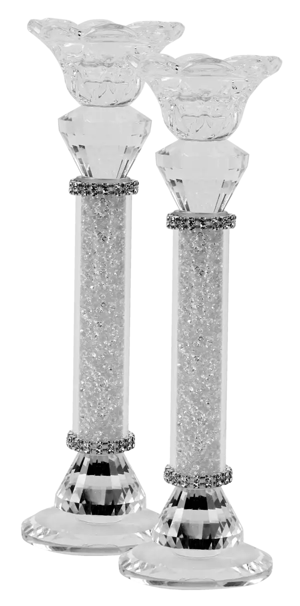Elegant crystal candlesticks adorned with rhinestone bands and filled with sparkling silver crystals. Each 9" tall candlestick features a faceted crystal base and decorative floral-inspired top, creating a stunning addition to your Shabbat table.