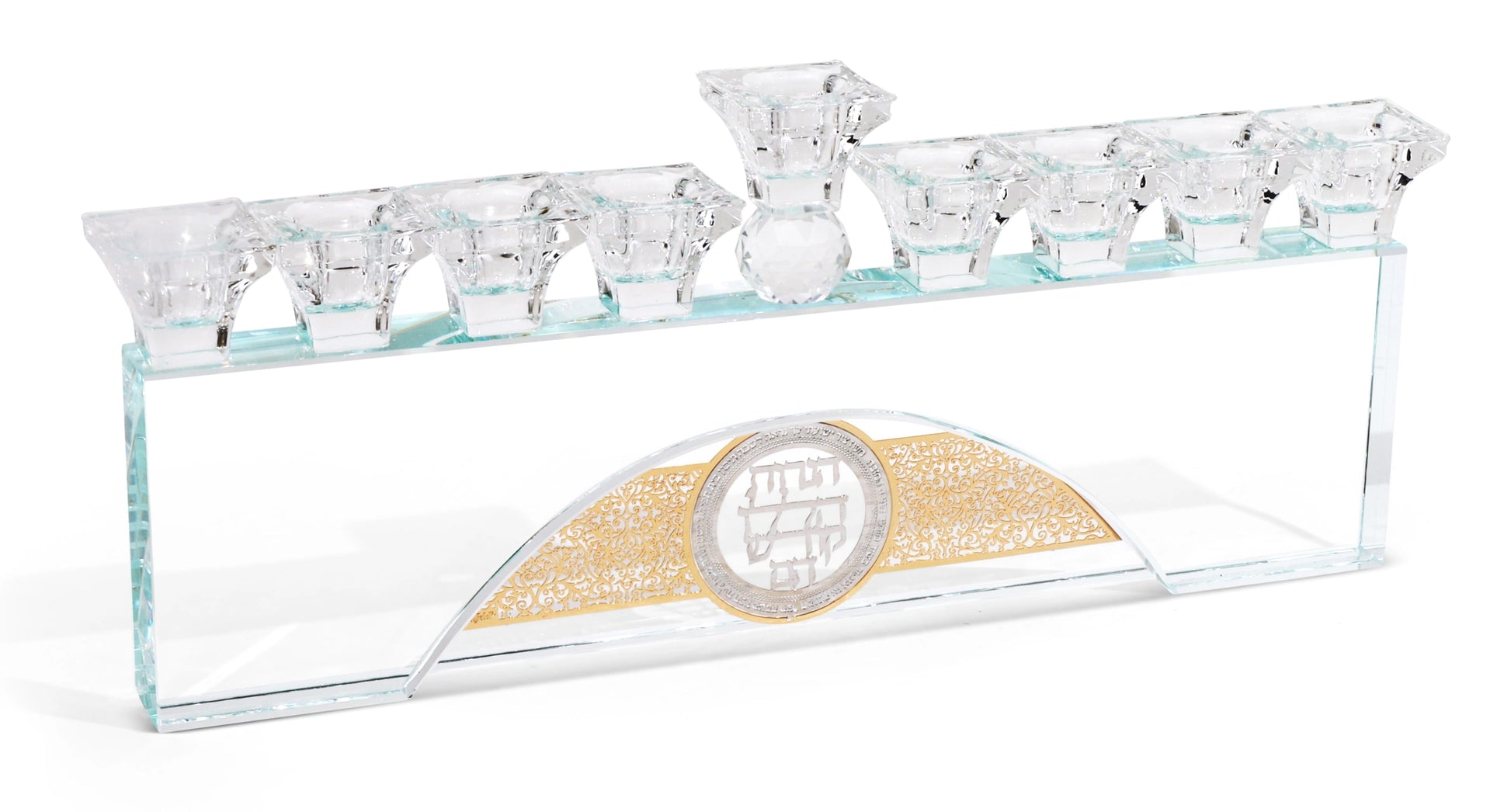 Elegant crystal menorah featuring geometric crystal candle holders mounted on a clear base with an artistic arc detail. The decorative centerpiece combines silver Hebrew blessing with intricate gold filigree patterns, creating a stunning blend of traditional and contemporary design.