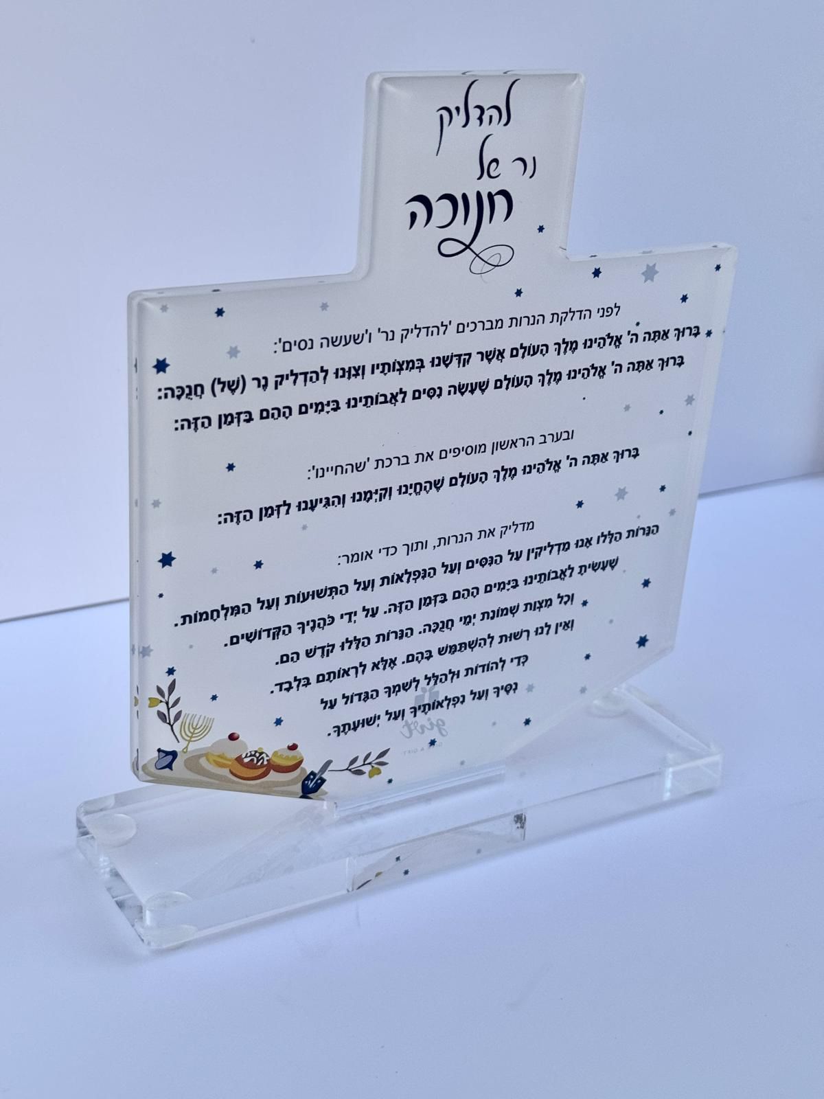 Our specially designed, premium acrylic display features the complete Hanukkah candle lighting blessings in elegant Hebrew text. Adorned with festive Hanukkah motifs of dreidels, donuts, and a menorah on a graceful vine, this substantial piece is crafted from thick, high-quality acrylic with a clear stand. This GIVT exclusive helps make your candle lighting ceremony both meaningful and beautiful