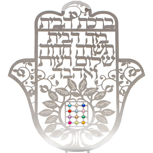 Elegant laser-cut Hamsa wall decoration featuring a heartfelt home blessing in Hebrew and intricate tree of life design. The centerpiece showcases a colorful representation of the High Priest's breastplate (Hoshen). This beautiful piece, measuring 18x15 cm (7x6 inches), combines traditional symbolism with modern artistry, perfect for adding a meaningful touch to any home.