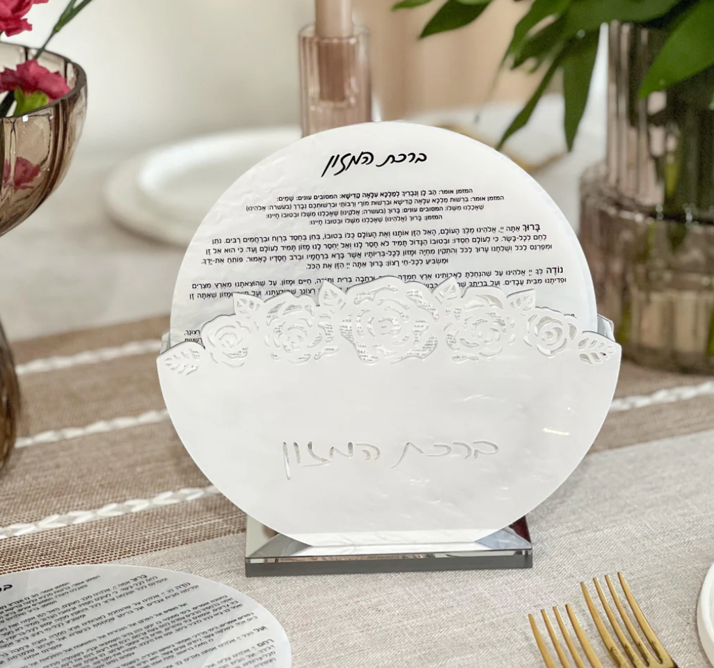 Elegant lucite benchers featuring intricate laser-cut flower designs, perfect for Shabbat and holiday tables. This 8-pack set combines traditional Edut Mizrach style with modern craftsmanship. The durable acrylic construction resists breakage while the round shape fits naturally in hand. Ideal for families seeking beautiful, practical blessings holders that blend heritage with contemporary aesthetics.