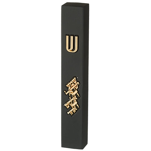Sleek black polyresin mezuzah case featuring elegant gold text . This minimalist case combines modern sophistication with traditional elements, crafted from durable polyresin for lasting beauty.