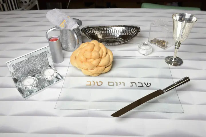Modern acrylic challah board featuring minimalist raised Hebrew text "Shabbat Yom Tov". This sleek, transparent serving board brings contemporary elegance to your holiday table while protecting your tablecloth.