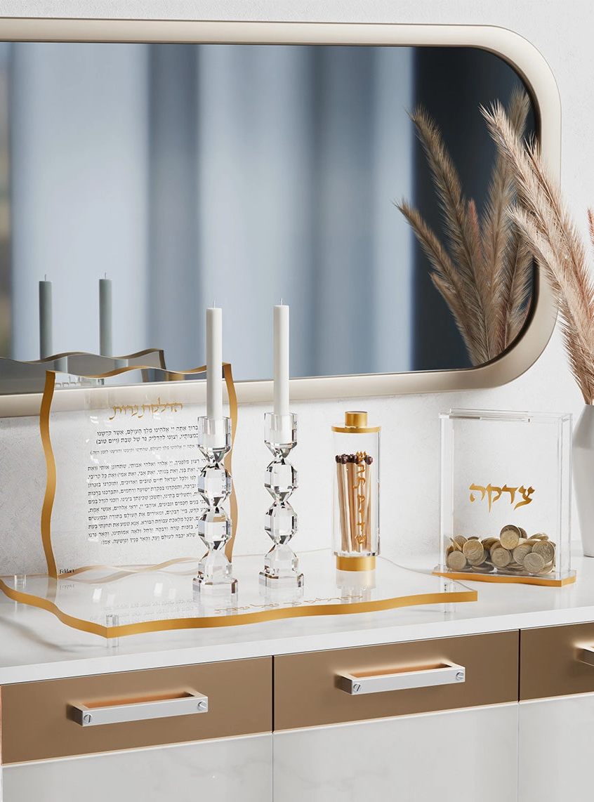 A stunningly opulent Wave Hadlokas Neiros Tray that will adorn the radiance of your Shabbos candles. An arresting and sophisticated accompaniment to any décor. Thick Lucite with elevated corners ensures it stands out with distinction.